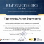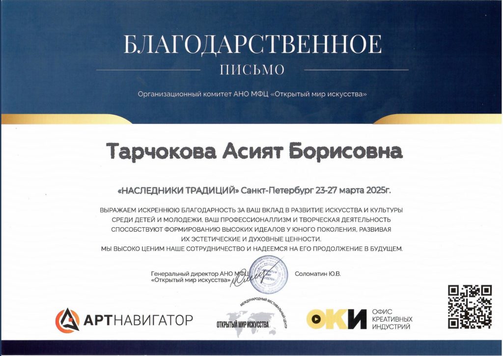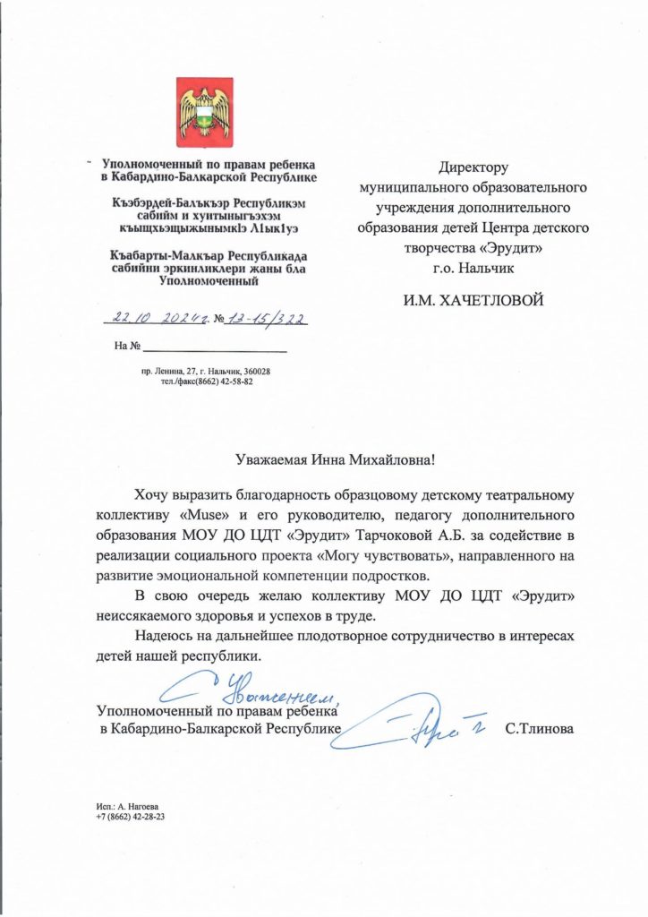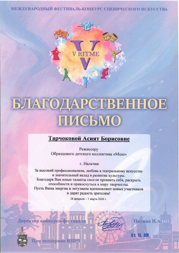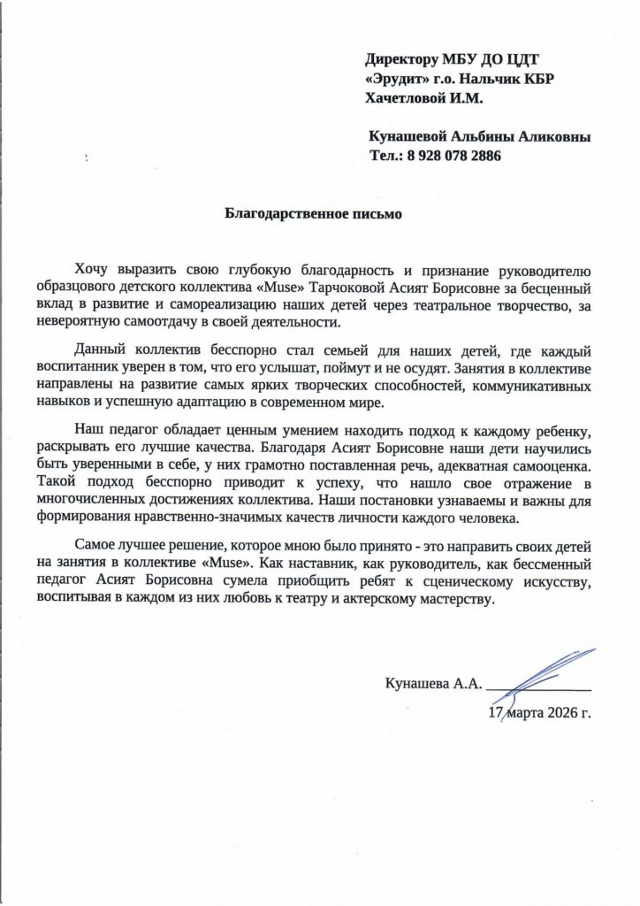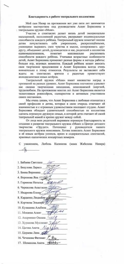15. Выражаю свою благодарность и признательность Тарчоковой Асият Борисовне за самый лучший, яркий, дружелюбный театральный коллектив “Muse”. Моя дочь посещает занятия уже четвертый год. За это время было поставлено множество спектаклей, имеющих нравственную направленность и социальную значимость. Наши дети, участники коллектива, стали победителями ряда конкурсов в Краснодаре, Санкт-Петербурге, Москве. Такие большие шаги окрыляют ребят, делают из них уверенных в себе личностей. Такая большая удача оказаться в руках талантливого педагога, настоящего профессионала! Асият Борисовна чувствует наших детей, понимает, относится с теплотой к каждому ребенку. Низкий поклон и огромная благодарность Вам!